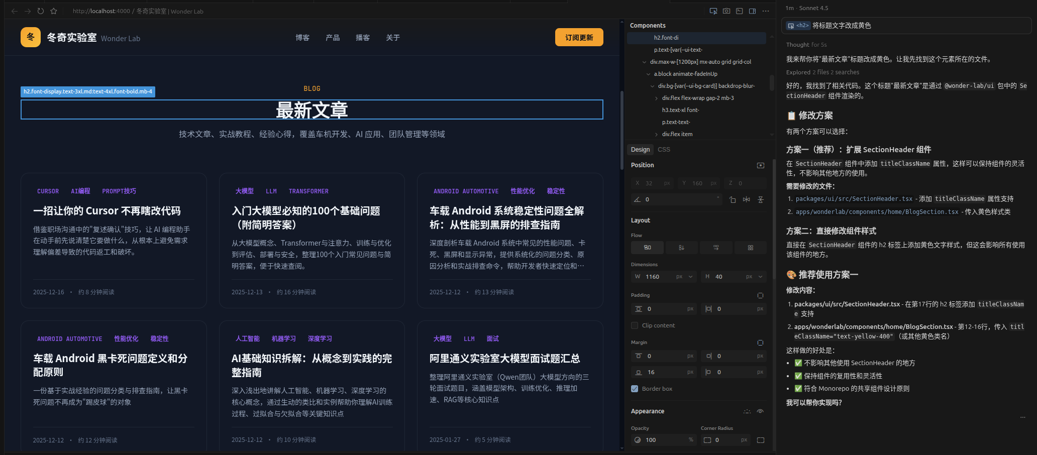 注意看右侧 AI 的回复,它不仅找到了对应的文件(SectionHeader.tsx 和 BlogSection.tsx),还贴心地给出了两种修改方案的优劣对比。这种"先理解再动手"的模式,大大降低了改错代码的风险。